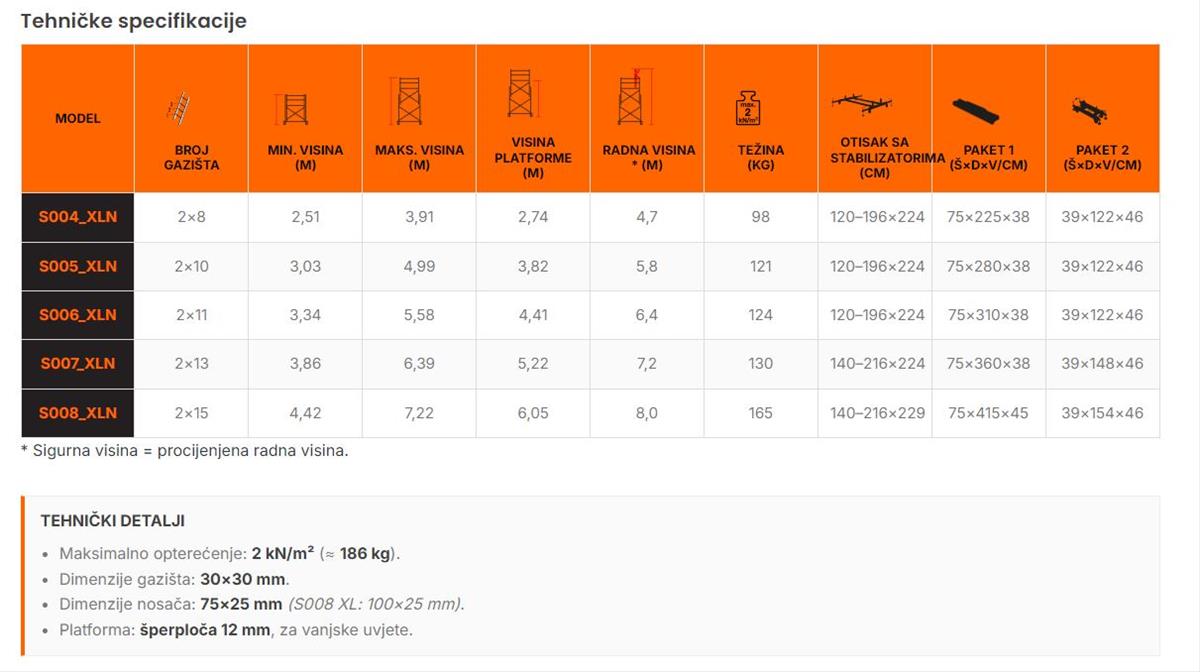 Konstrukciju čine dijagonalne i vodoravne prečke izrađene od željeznih cijevi, a inovativan Q-lock sustav omogućuje brzu i sigurnu instalaciju. Sustav konopa i remenica omogućuje podešavanje visine platforme i visinu skele za po 28 cm. Zaštitne ograde visine su 100 cm, vrata omogućuju siguran pristup platformi.